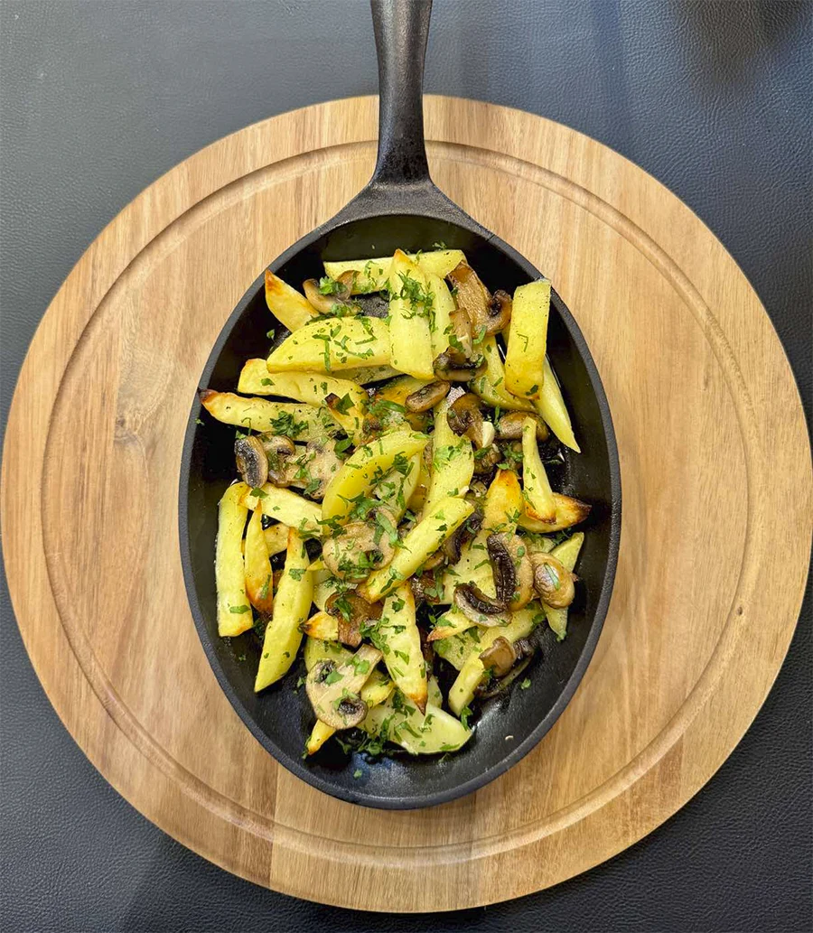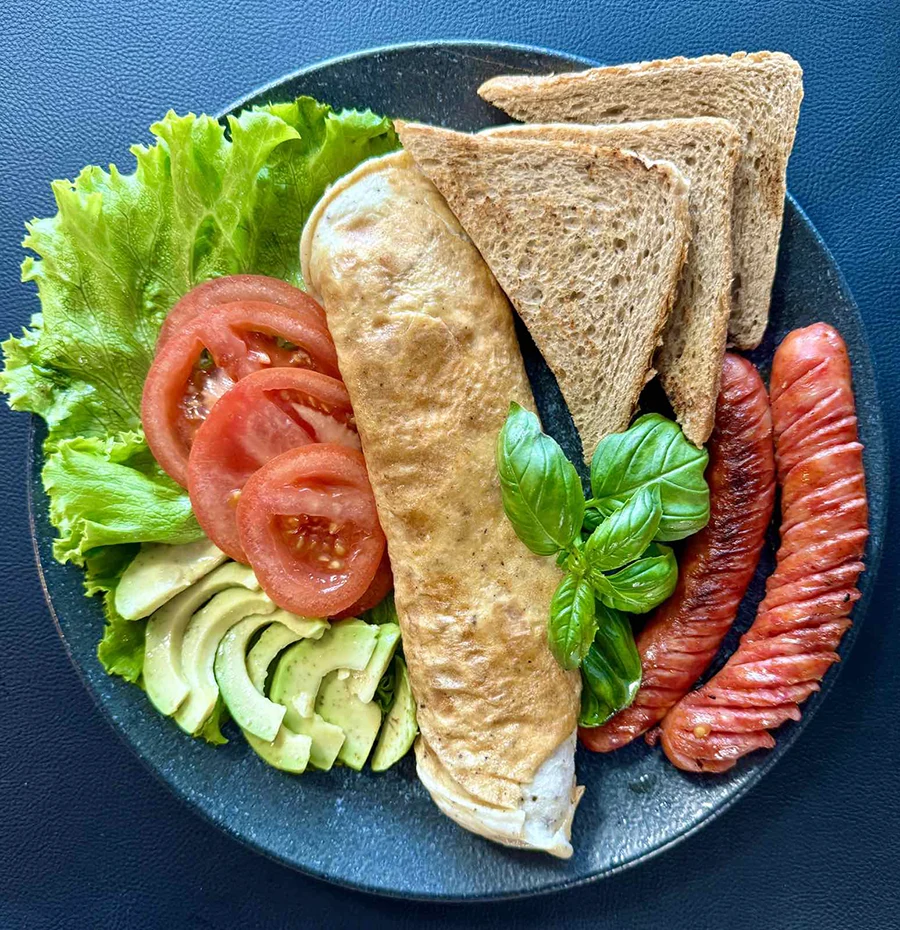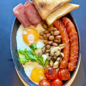 ouă, bacon, cârnați, fasole în sos de roșii, roșii, ciuperci, pâine prăjită
