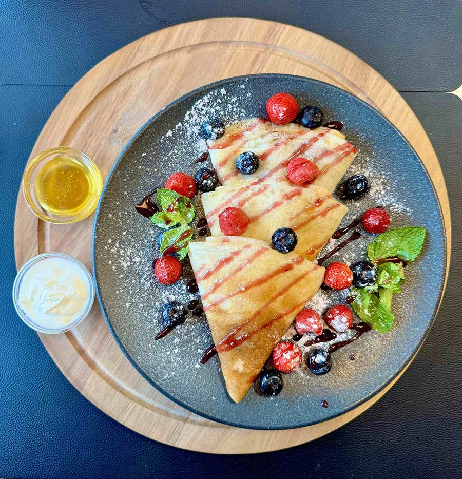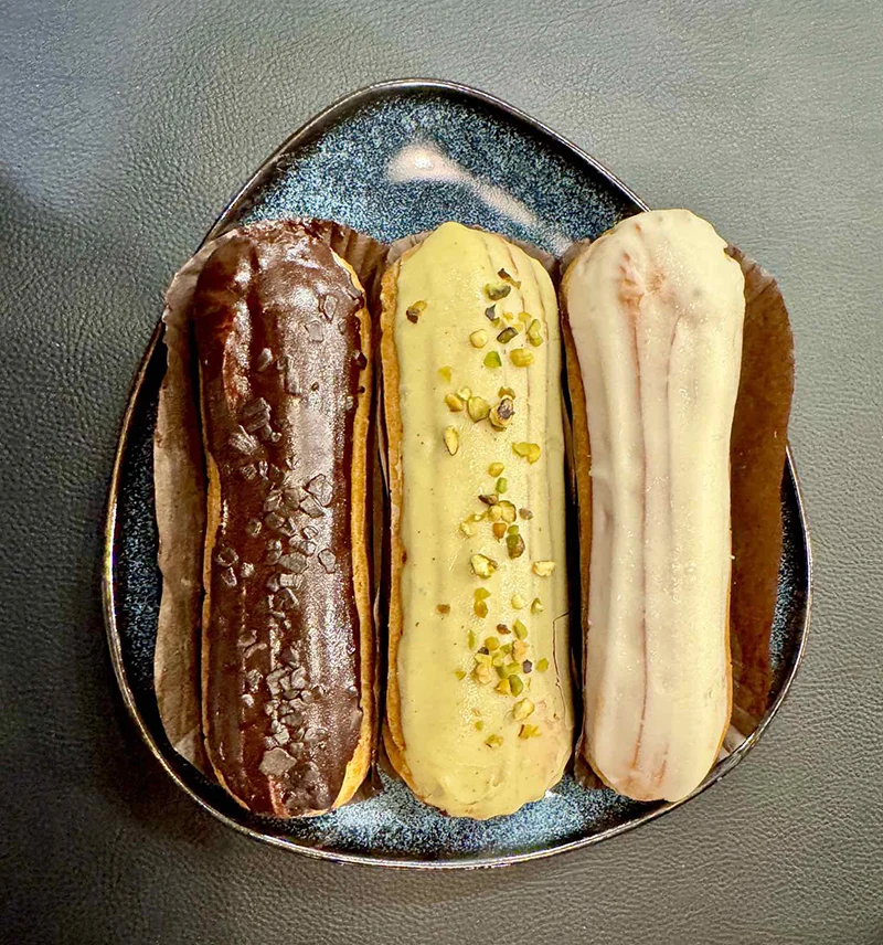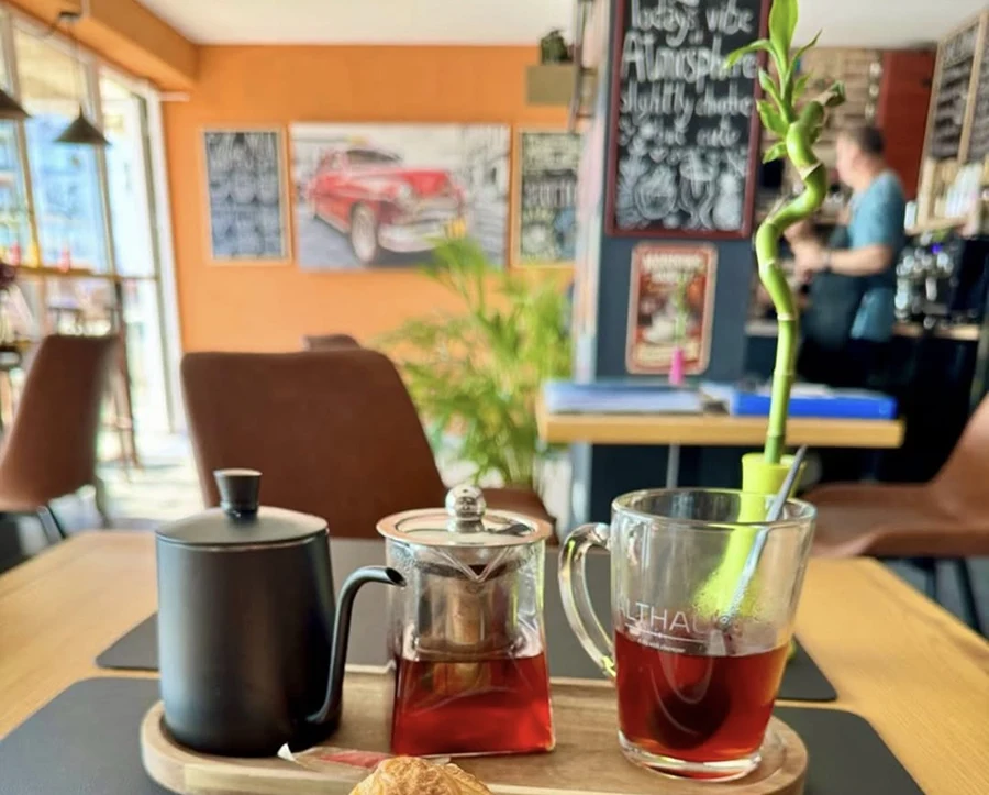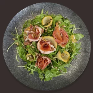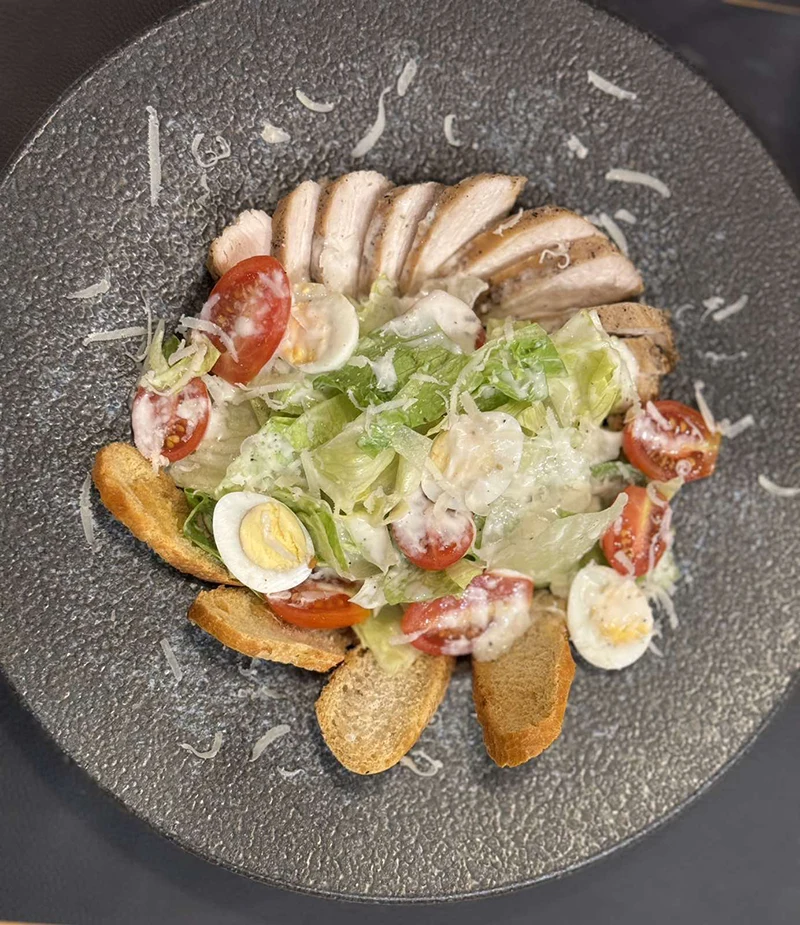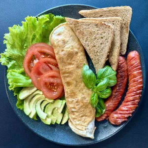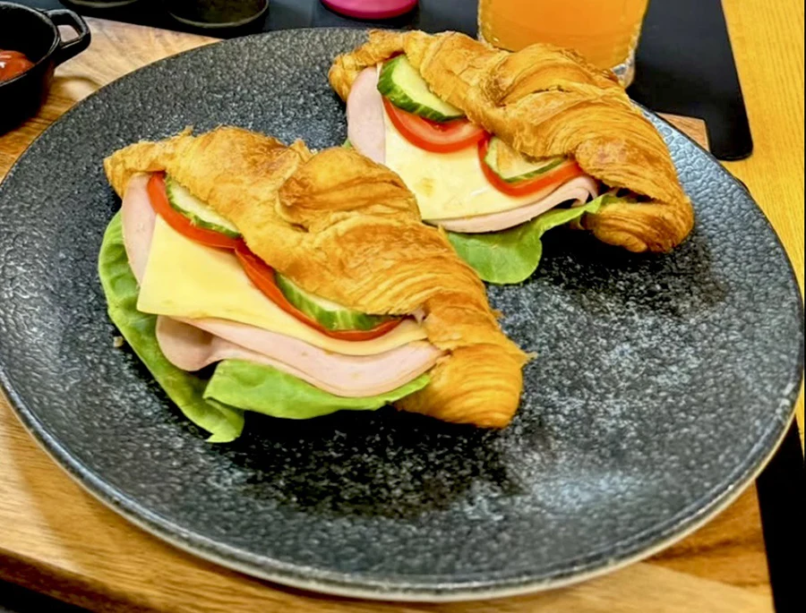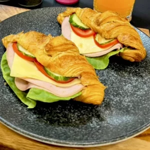 croissant, șuncă, brânză, roșii, castraveți, ierburi aromatice